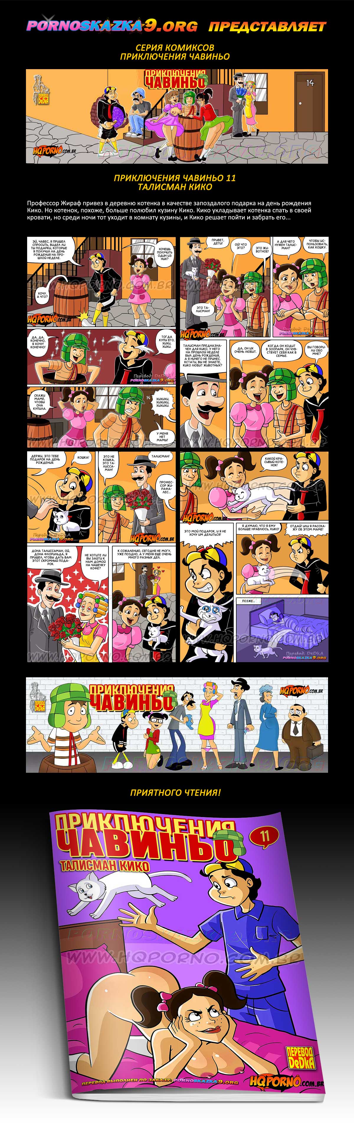 Порно комикс «Приключения Чавиньо. Часть 11. Талисман Кико.» Профессор Жираф привез в деревню котенка в качестве запоздалого подарка на день рождения Кико. Но котенок, похоже, больше полюбил кузину Кико. Кико укладывает котенка спать в своей кровати, но среди ночи тот уходит в комнату кузины, и Кико решает пойти и забрать его…